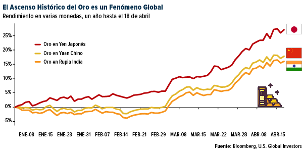 El reciente aumento del oro no es sólo una historia del dólar estadounidense. El metal precioso también está logrando avances históricos en varias monedas de todo el mundo, desde el yen japonés hasta el yuan chino y la rupia india. Este fenómeno global subraya el atractivo universal del oro como reserva de valor y un medio para preservar el poder adquisitivo.