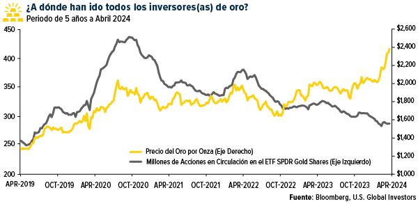 Los precios más altos no necesariamente han resultado en una mayor inversión en Estados Unidos, y Ralph y yo creemos que los inversionistas pueden estar dejando una oportunidad sobre la mesa. A pesar de que el precio del oro ha aumentado en los últimos cuatro años, el número de acciones en circulación en el ETF SPDR Gold Shares (GLD) ha disminuido, lo que indica que la demanda tiene mucho que recuperar.