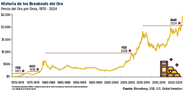 El oro alcanzó recientemente un nuevo máximo histórico de 2.432 dólares por onza, marcando lo que Ralph y yo vemos como una de los grandes breakouts (rupturas) del oro desde el fin de Bretton Woods. El atractivo del metal amarillo como cobertura contra la incertidumbre, junto con compras mensuales constantes por parte de los bancos centrales, no sólo ha elevado el precio mínimo sino que debería ayudar al activo a alcanzar nuevos máximos en las próximas semanas y meses.