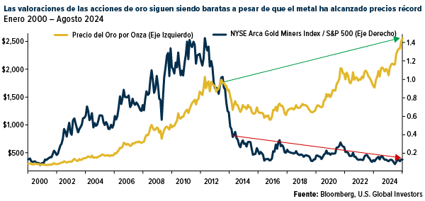 Y, sin embargo, a pesar del rally alcista, las acciones de oro (las empresas que extraen, procesan y venden el metal) se cotizan a valoraciones históricamente bajas en relación con el mercado.