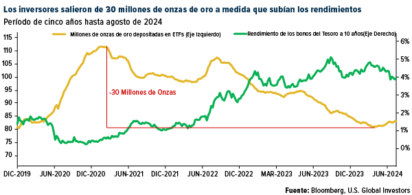 Eso es exactamente lo que sucedió. Desde fines de 2020 hasta mayo de 2024, los fondos cotizados en bolsa (ETF) respaldados por oro físico perdieron aproximadamente 30 millones de onzas, más de una cuarta parte de sus tenencias totales, a medida que los inversores en busca de rendimientos redujeron sus posiciones.