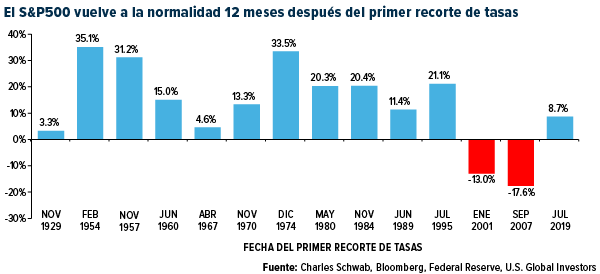 El mercado de valores subió 12 de las 14 veces (o el 86 por ciento de las veces) un año después de que la Reserva Federal hiciera su recorte inicial en un nuevo ciclo de flexibilización. Schwab señala que los dos períodos negativos consecutivos se basaron en circunstancias extraordinarias: la burbuja de las puntocom en 2001 y la crisis inmobiliaria en 2007. El desempeño pasado no es garantía de resultados futuros, pero vale la pena considerarlo.