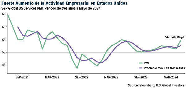 La recuperación de la industria aérea es parte de una tendencia positiva más amplia en el sector de servicios. El PMI de servicios de S&P Global US, que incluye la industria aérea, subió a un máximo de un año de 54,8 en mayo, superando su promedio móvil de tres meses. Esto apunta a una marcada expansión de la actividad de servicios, lo que refleja una fuerte demanda de los consumidores y la confianza empresarial.