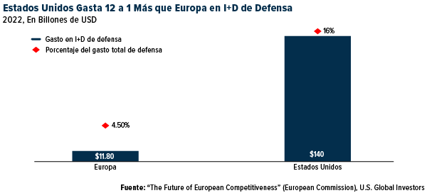 La evaluación de Draghi pone de relieve esta vulnerabilidad y aboga por un cambio significativo de estrategia. Señala que el gasto de Europa en I+D de defensa fue de apenas 10.7 billones de euros (11.8 billones de dólares) en 2022 (alrededor del 4,5% del gasto total de defensa), en comparación con Estados Unidos, que gastó 140 billones de dólares (el 16% del gasto total de defensa). Esto no es sostenible si Europa espera volverse más autosuficiente en defensa, especialmente mientras las tensiones con Rusia siguen aumentando.