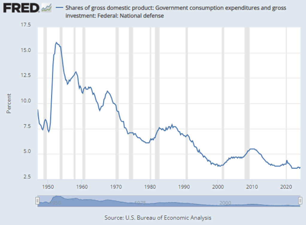 Sería una tarea difícil. En la actualidad, Estados Unidos gasta el 3,7% de su PIB en defensa nacional, una cifra muy inferior al 15% o 16% que gastaba en el apogeo de la Guerra Fría, a principios de los años 50.