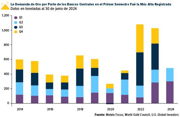 No son solo los inversores los que impulsan el aumento del oro. Los bancos centrales están desempeñando un papel fundamental. En los últimos años, estas instituciones han aumentado significativamente sus reservas de oro y su oleada de compras no muestra signos de desaceleración. Las compras de los bancos centrales representan ahora alrededor de una cuarta parte de la demanda mundial total de oro, lo que duplica lo que era antes de 2022. La compra de oro alcanzó un nuevo récord de 483 toneladas en el primer semestre del año, un aumento del 5% con respecto al mismo período de 2023, según el Consejo Mundial del Oro (WGC).