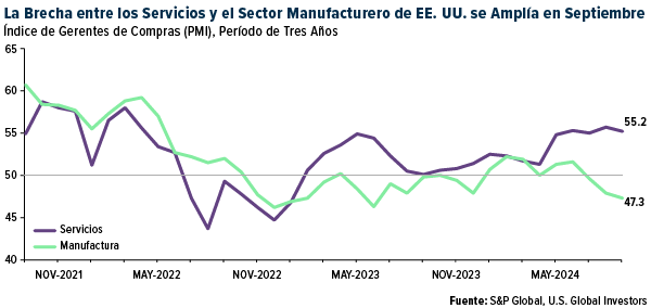 Según S&P Global, el sector de servicios de Estados Unidos, que representa casi el 80% del PIB del país, lleva veinte meses de expansión consecutiva. Los pedidos nuevos siguen aumentando, impulsados por una demanda constante de los consumidores y una reducción de las tasas de interés, lo que ha hecho que los préstamos sean más asequibles tanto para las empresas como para los hogares. A pesar de cierta moderación desde el máximo de catorce meses que registramos en agosto, el sector parece sólido y proporciona una base para la estabilidad económica.