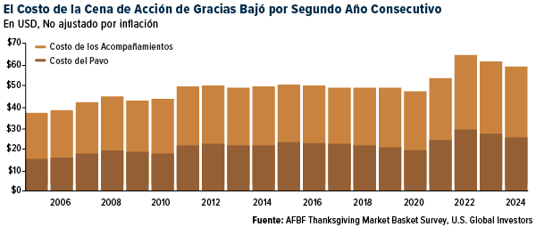 La semana pasada, cuando las familias en Estados Unidos se reunieron para celebrar el Día de Acción de Gracias, hubo una buena noticia para los consumidores: el costo de la tradicional cena bajó por segundo año consecutivo. Una cena típica para 10 personas costó $58,08, un 5% menos que el año pasado, según la encuesta anual de la American Farm Bureau Federation (AFBF).