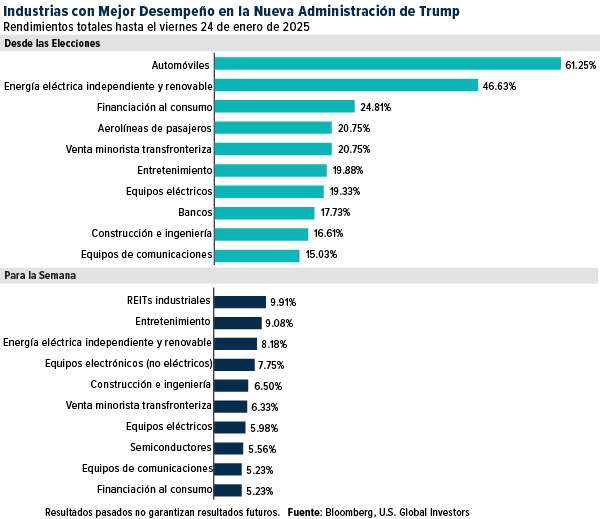 También quiero compartir las industrias con mejor desempeño durante el período de cinco días de la semana pasada, ya que el presidente Trump ha firmado una cantidad histórica de órdenes ejecutivas desde que asumió el cargo. La lista incluye muchas de las mismas áreas (generación de energía, construcción e ingeniería, financiación al consumo, venta minorista), pero hay un agregado interesante: los REIT industriales. (REIT: Real Estate Investment Trusts / Fideicomisos de Inversión en Bienes Raíces).