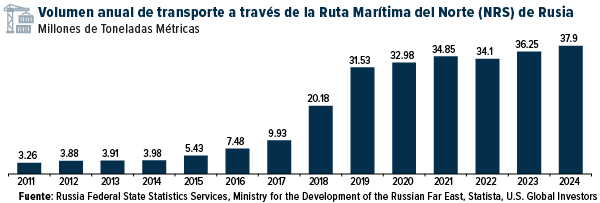 En 2024, se transportaron alrededor de 38 millones de toneladas métricas de carga a través de la Ruta Marítima del Norte (NSR) de Rusia, una cantidad récord para un solo año y un aumento de casi diez veces con respecto a una década antes. La NSR es fundamental para la visión del presidente Vladimir Putin de una ruta marítima que rivalice con el Canal de Suez y el Canal de Panamá, pero desafíos como aguas poco profundas y llenas de hielo y condiciones de niebla significan que la ruta tiene un largo camino por recorrer antes de convertirse en una ruta marítima global.