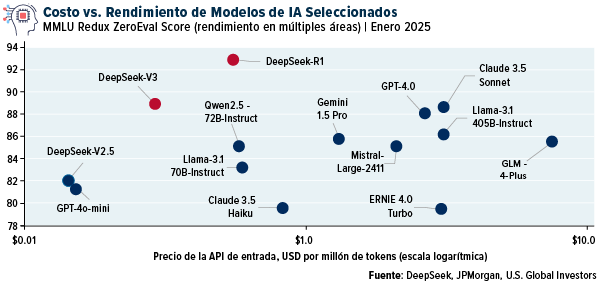 ¿A qué se debe la volatilidad? El modelo de IA de DeepSeek, creado a una fracción del costo de los principales modelos estadounidenses, indica la posibilidad de una nueva guerra de precios en IA. A diferencia de los modelos ChatGPT de OpenAI y Llama de Meta (entrenados con costosos semiconductores de alta gama), DeepSeek ha desarrollado una alternativa que supuestamente es 45 veces más eficiente que sus competidores. Su última prueba de entrenamiento costó solo $5,6 millones de dólares, en comparación con las sumas mucho más altas requeridas para los modelos fabricados en Estados Unidos.