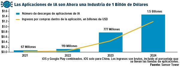 El auge de la IA ya está generando enormes repercusiones económicas. Según Sensor Tower, los ingresos por chatbots y generadores de arte basados en IA se han disparado de $30 millones de dólares en 2022 (el año en que se lanzó ChatGPT) a casi $1.3 billones de dólares en 2024, lo que representa un increíble aumento del 4100 %. Sensor Tower informa que Estados Unidos lidera el mundo en monetización de IA, representando el 45 % de los ingresos globales, mientras que China se queda atrás con solo el 2 %.