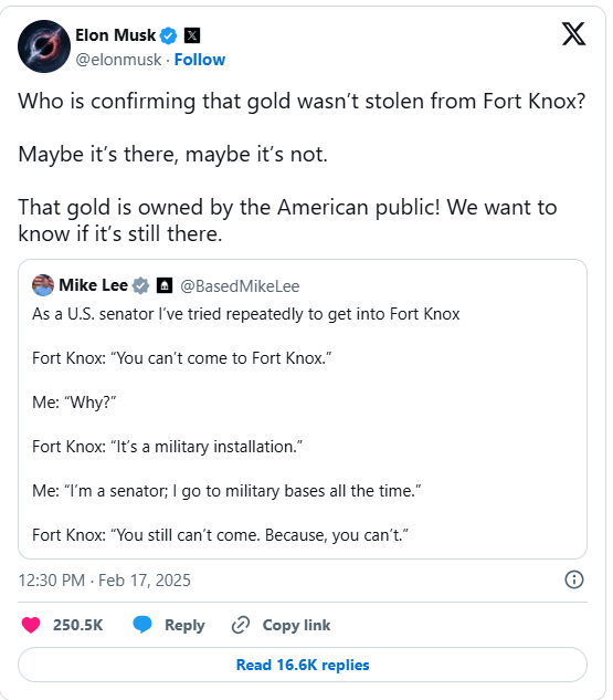 Elon Musk ha anunciado sus planes de llevar a cabo una auditoría presencial de las reservas de oro de Fort Knox en nombre de su operación de reducción de costes, el Departamento de Eficiencia Gubernamental (DOGE). En un tuit del 17 de febrero, Musk escribió: “¿Quién confirma que no se robó oro de Fort Knox? Queremos saber si todavía está allí”.