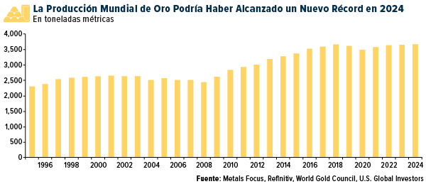 En cuanto a la oferta, la producción total de oro aumentó hasta un récord de 4.974 toneladas en 2024, impulsada por el aumento de la producción minera y el reciclaje. Las estimaciones iniciales sugieren que la producción minera alcanzó un máximo histórico de 3.661 toneladas, aunque las cifras finales podrían revisar este récord. Sin embargo, las perspectivas de oferta a largo plazo son menos optimistas.