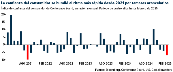 Eso es exactamente lo que estamos viendo hoy. La confianza del consumidor ha estado cayendo: el índice del Conference Board cayó siete puntos en febrero, la mayor caída desde agosto de 2021.