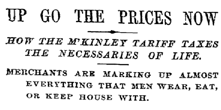 En octubre de 1890, poco después de que entrara en vigor el arancel McKinley, el New York Times informó que las empresas de múltiples industrias estaban aumentando los precios al consumidor en general, incluidos los de ropa para hombres y mujeres, alimentos, artículos de hojalatería, relojes, libros y más.
