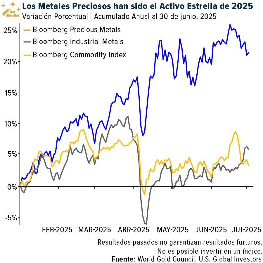 Los metales preciosos dominaron el primer semestre. Como se puede observar en el gráfico a continuación, este grupo —que incluye oro, plata, platino y paladio— aplastó por completo a las materias primas en su conjunto, desde los metales industriales hasta los energéticos y agrícolas.