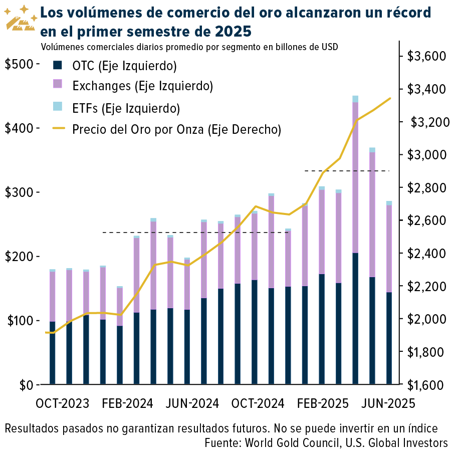 Los ETFs de oro con respaldo físico atrajeron la impresionante cifra de $38 billones de dólares en entradas durante el primer semestre del año, lo que marca el mejor rendimiento desde el repunte impulsado por la pandemia en el primer semestre de 2020. Los inversores norteamericanos lideraron la tendencia, aportando $21 billones de dólares. El volumen de operaciones se disparó en todos los ámbitos, alcanzando un promedio de $329 billones de dólares diarios a nivel mundial, un nuevo récord, según el Consejo Mundial del Oro (WGC).