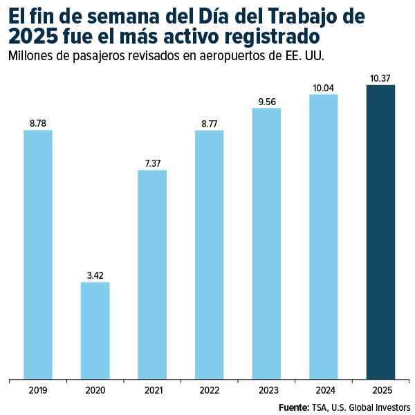Este verano, la Administración de Seguridad en el Transporte (TSA) registró un número récord de pasajeros. Tan solo durante el fin de semana del Día del Trabajo, casi 10,4 millones de viajeros pasaron por el control de seguridad del aeropuerto, un aumento del 3,3 % con respecto al año pasado. Ocho de los diez días de mayor afluencia en las dos décadas de historia de la TSA ocurrieron este verano.