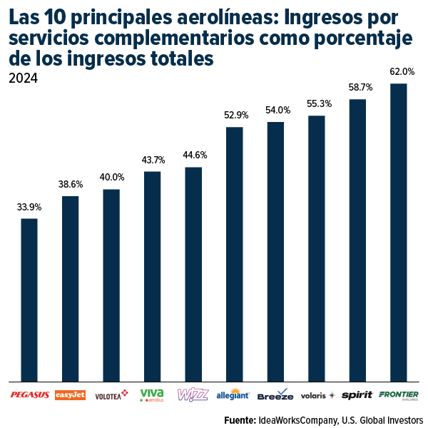 Cabe recordar que Spirit fue en su día el ejemplo perfecto del modelo ULCC. Su enfoque sin extras —asientos no reclinables, cargos por equipaje de mano y precios a la carta— le permitió ofrecer tarifas muy bajas que atrajeron a los viajeros preocupados por el precio. Los ingresos por servicios complementarios se convirtieron en su principal fuente de ingresos, con casi el 59 % de sus ingresos totales en 2024 provenientes de estos servicios, según datos de IdeaWorks. Esto situó a Spirit cerca de la cima del ranking mundial.