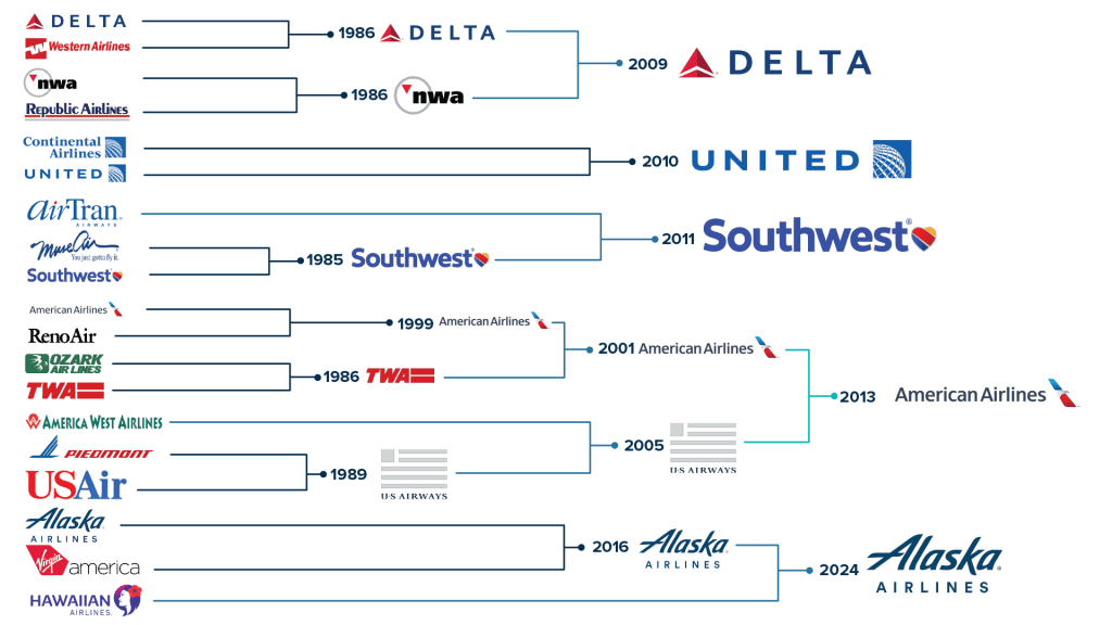 Para cuando estalló la crisis financiera, las aerolíneas eran más eficientes y estaban mejor preparadas para resistir las crisis. US Airways se fusionó con America West en 2005, y Delta absorbió a Northwest en 2008. Estas fusiones dieron lugar al panorama competitivo que conocemos hoy, dominado por cuatro grandes aerolíneas, seguidas con vehemencia por Alaska Airlines, que finalizó la adquisición de Hawaiian Airlines el año pasado y ahora controla poco más del 6% del mercado nacional.