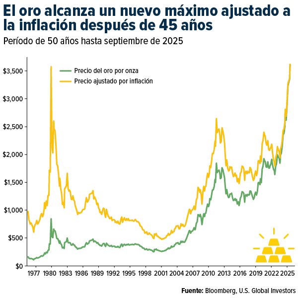 En la primera semana de septiembre, el metal registró su sexto nuevo máximo histórico en tan solo siete días de negociación. Tras superar su récord ajustado a la inflación, establecido en 1980, el oro ha alcanzado máximos históricos no solo en dólares estadounidenses, sino también en euros, libras, yuanes y prácticamente todas las divisas principales.