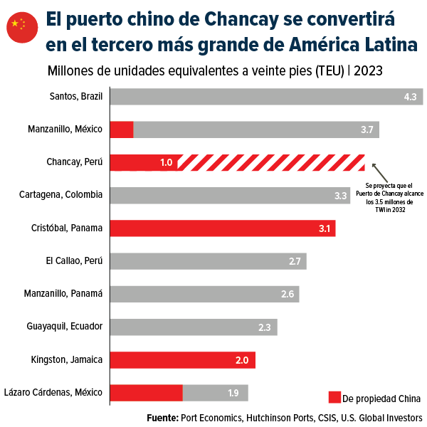 El Centro de Estudios Estratégicos e Internacionales (CSIS) estima que, una vez expandido por completo, Chancay podría manejar 3,5 millones de contenedores al año, lo que potencialmente lo convertiría en el tercer puerto más grande de América Latina y el más grande controlado completamente por una empresa estatal china.
