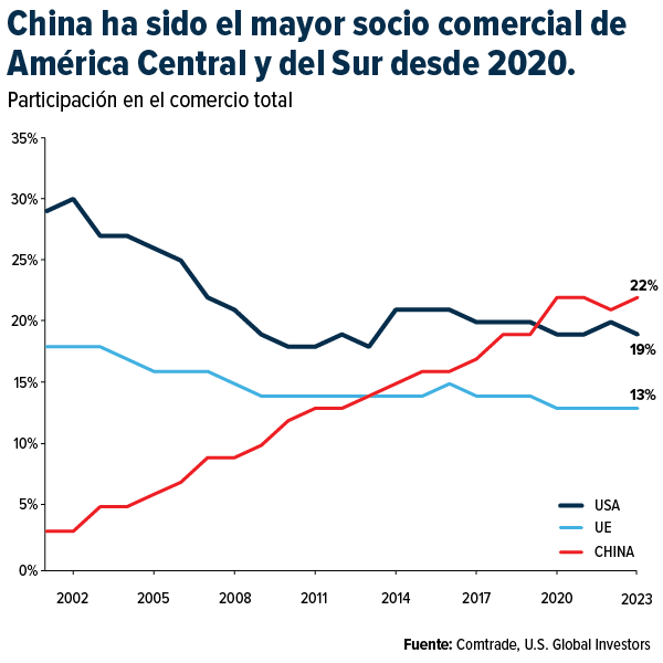 ¿Cómo llegamos a esta situación? Tras su incorporación a la Organización Mundial del Comercio (OMC) en 2001, el comercio de China con América Latina creció un promedio del 31 % anual durante aproximadamente la década siguiente. En 2024, el comercio bilateral entre ambas regiones alcanzó los $518.000 millones de dólares, superando a Estados Unidos como principal socio comercial de Sudamérica. Los analistas prevén que esa cifra alcance los $700.000 millones de dólares para 2035. China es el mayor comprador de litio de Argentina, crudo de Venezuela y soja y mineral de hierro de Brasil.