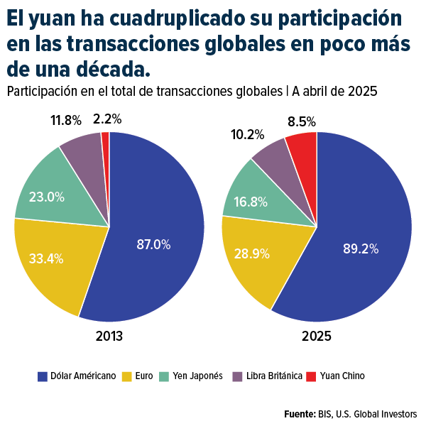 Todo esto coincide con el ascenso del yuan chino como activo de reserva y moneda de pago. Según el Banco de Pagos Internacionales (BPI), el yuan representa ahora el 8,5 % de las transacciones globales, frente al 7 % de hace tan solo tres años, acercándose al 10,2 % de la libra esterlina. El dólar estadounidense sigue siendo, con diferencia, el líder mundial, representando casi el 90 % de todas las transacciones, pero el yuan ha logrado avances impresionantes, cuadruplicando su participación en el total de transacciones desde 2013.