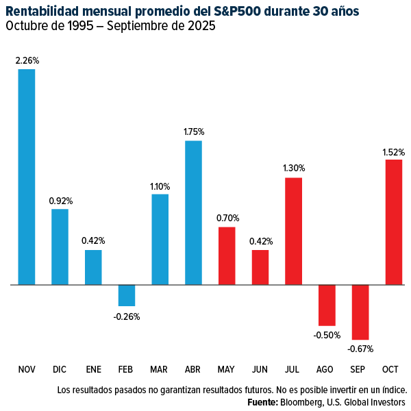 El posible repunte comienza este mes, históricamente el mejor mes para las acciones. En un período de 30 años, el S&P 500 subió un 2,6% en promedio en noviembre, seguido de un 1,7% en abril.