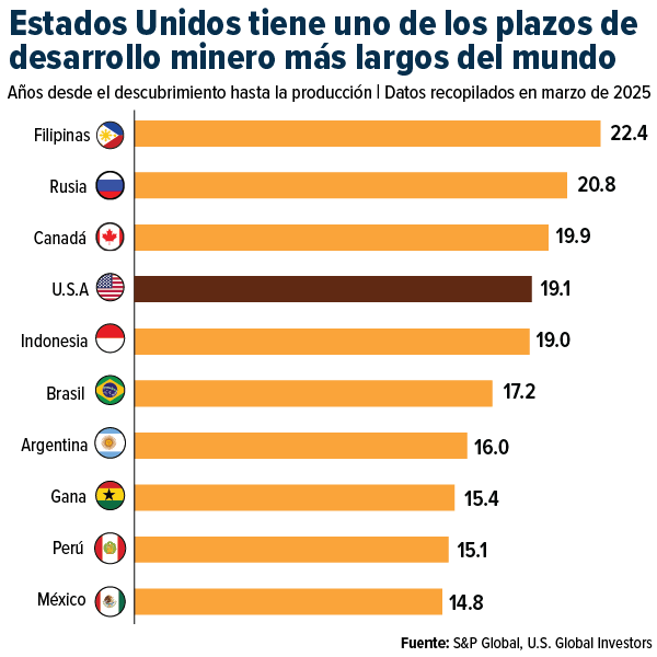 El desafío es convertir el mineral en bruto en metal utilizable con rapidez y escala. Incluso si quisiéramos desarrollar rápidamente nuevos suministros, no podríamos. El tiempo necesario para poner en funcionamiento una nueva mina de cobre en EE. UU. es de un promedio de 19 años, uno de los más largos del mundo.