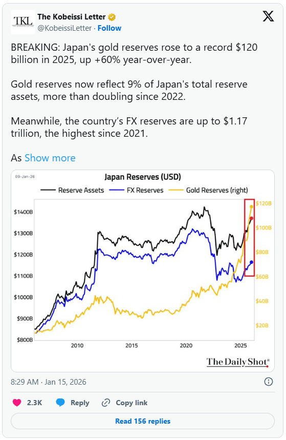 Los mercados emergentes han liderado las compras durante la última década, pero algunos países de altos ingresos también han participado. La Carta Kobeissi informa que las reservas de oro de Japón alcanzaron un nuevo máximo histórico en 2025. Las reservas ascendieron a $120.000 millones de dólares, un impresionante aumento del 60 % con respecto al año anterior.