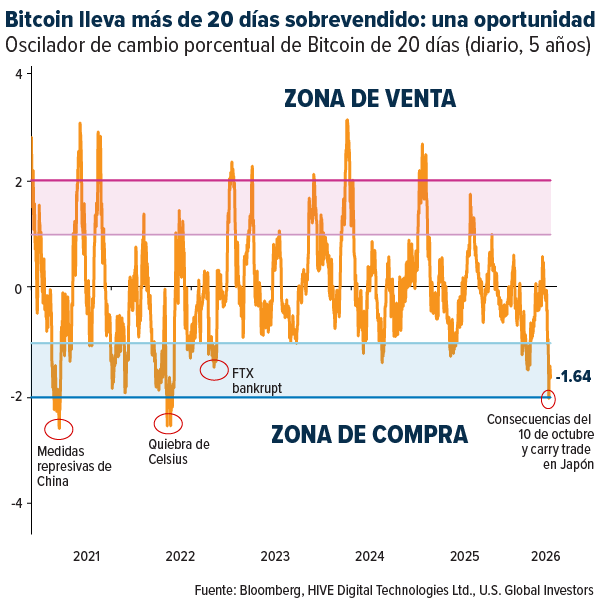 Como comenté en PreMarket Prep la semana pasada, desde un punto de vista técnico, Bitcoin se encuentra ahora aproximadamente dos desviaciones estándar por debajo de su promedio de 20 días de negociación. Este es un nivel que solo hemos visto tres veces en los últimos cinco años. Históricamente, estos extremos han favorecido rebotes a corto plazo durante los 20 días de negociación posteriores.