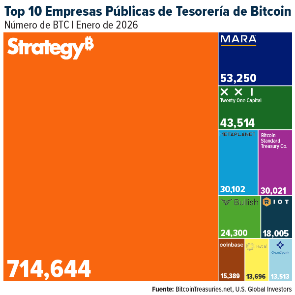 La adopción institucional se ha acelerado. Las tesorerías corporativas de Bitcoin —lo que llamamos empresas de Tesorería de Activos Digitales (DAT)— poseen actualmente más de 1,1 millones de BTC, lo que representa el 5,7 % del suministro total y está valorado en aproximadamente 90 000 millones de dólares. Strategy (anteriormente MicroStrategy) por sí sola ha creado una posición que representa el 3,5 % del suministro total de Bitcoin. En enero, las instituciones añadieron aproximadamente 43 000 Bitcoin a sus carteras a pesar del difícil entorno de precios.