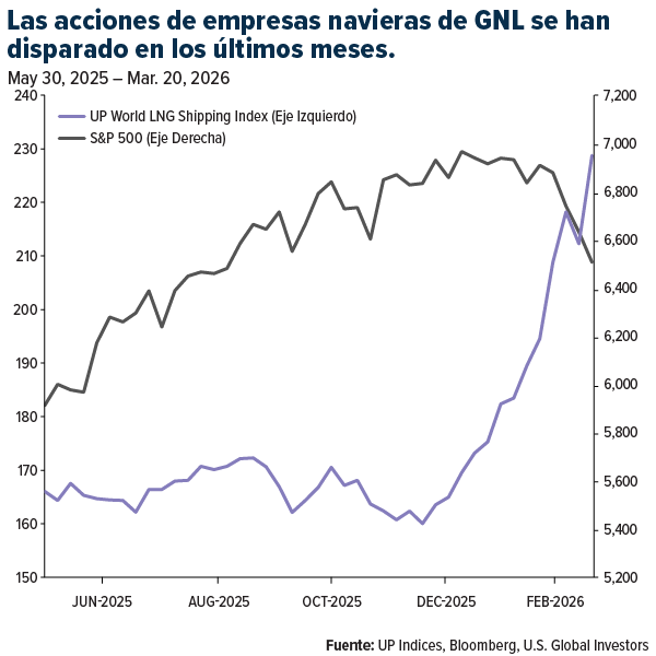 El índice UP World LNG Shipping Index, que sigue la evolución de 20 compañías navieras de GNL que cotizan en bolsa, subió casi un 8% en la semana que finalizó el 20 de marzo, incluso cuando el S&P 500 cayó casi un 2%.