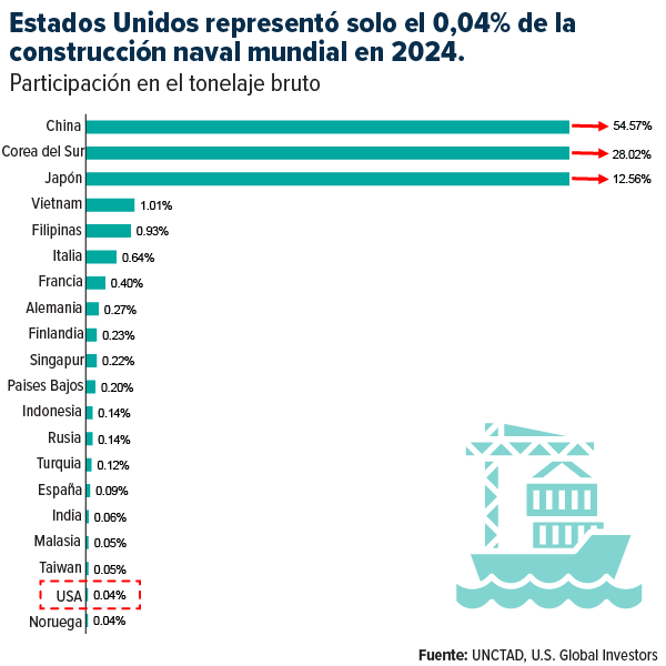 En comparación, Estados Unidos fabrica apenas el 0,04%. La mayor economía del mundo y la nación con una de las costas más largas del planeta prácticamente no construye buques comerciales.