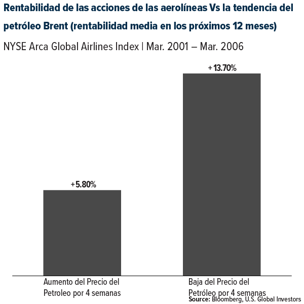 Cuando el precio del petróleo había subido durante las últimas cuatro semanas, las acciones de las aerolíneas registraron una rentabilidad media de casi el 6% durante el año siguiente. Por el contrario, cuando el petróleo había bajado durante cuatro semanas, la rentabilidad media fue de casi el 14%.
